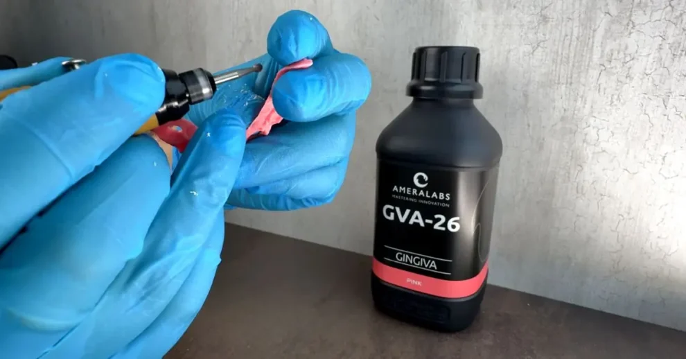 GVA-26 is a flexible gingiva resin made for 3D printing removable gingiva masks and other soft tissue parts used in dental labs. It stands out because you can cut, trim, and drill it after printing with normal dental tools such as scalpels, carbide or diamond burs, and slow-speed handpieces under 10,000 RPM.